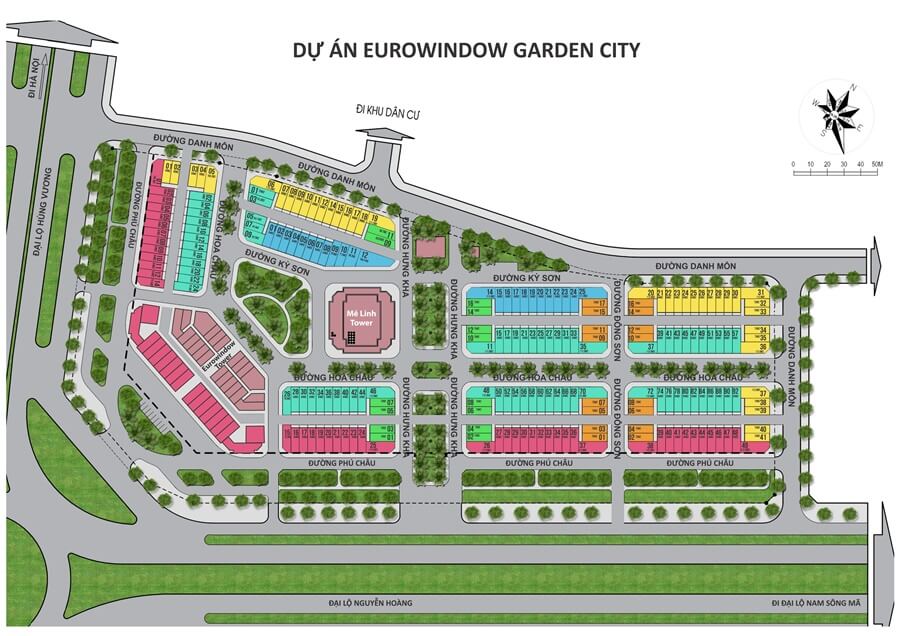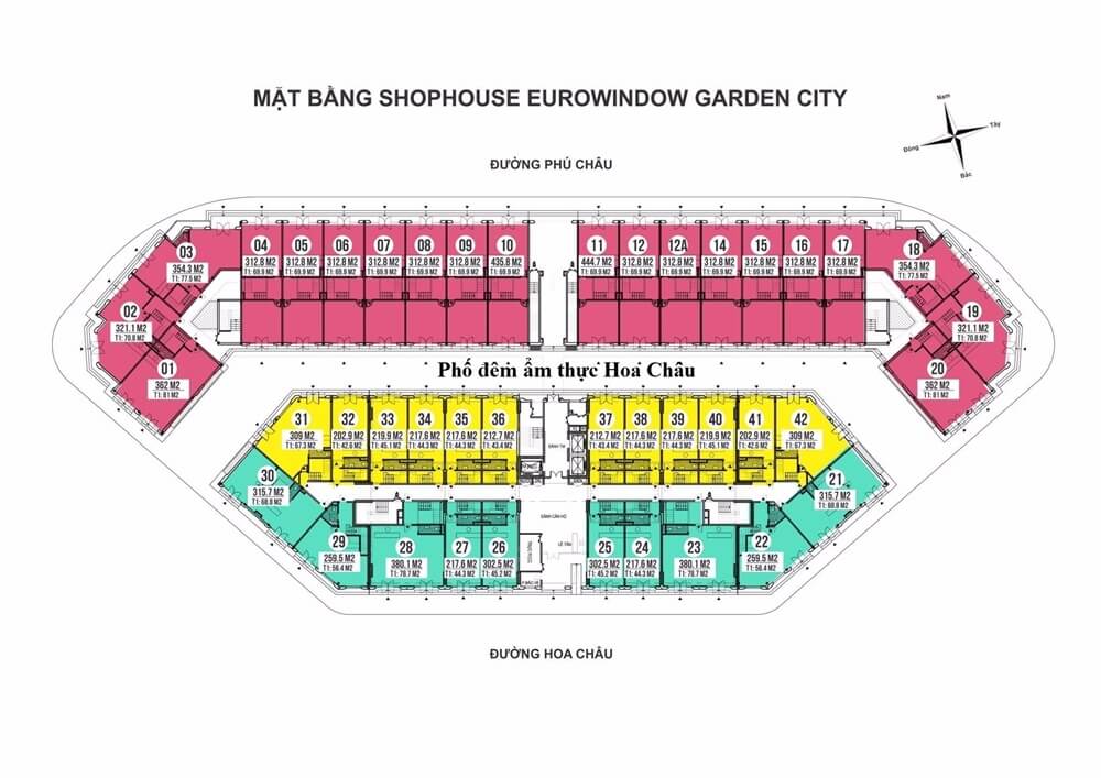 - Shophouse thương mại mặt tiền đường Hoa Châu, đối diện vườn hoa trung tâm của khu đô thị.